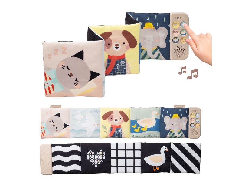 Součástí knížky je hudební modul, který nabízí pět realistických zvuků zvířátek (pes, kočka, slon, kachna a ptáčci), pět zvuků přírody (šumění, mořské vlny, déšť, proudění řeky, tlukot srdce) a sedm minut uklidňujícíh melodií. Zvuky a melodie se snadno pouští pomocí tlačítek.